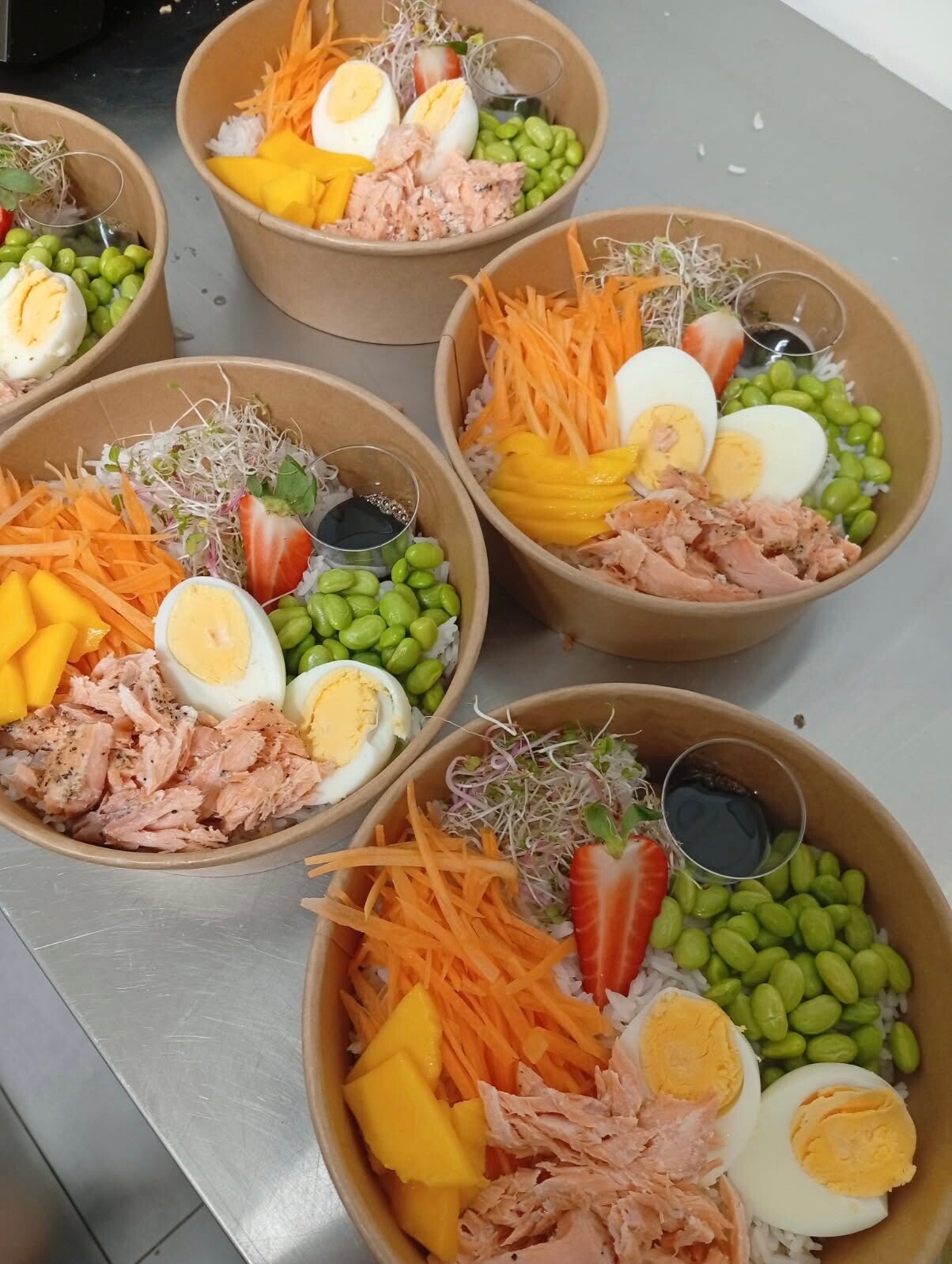 jaśminowy ryż, avocado, mango, zielone edamame,